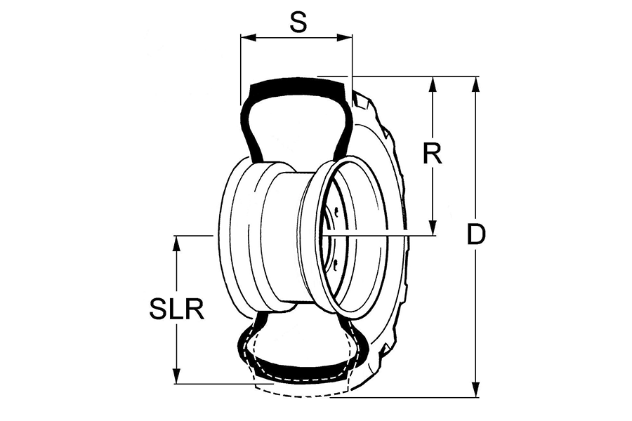 When designing a step-down/step-up dual wheel for either a tractor or combine, the SLR (static loaded radius) figure is key. SLR - is the distance from the centre of the axle to the ground, with the tyre deflected under load.